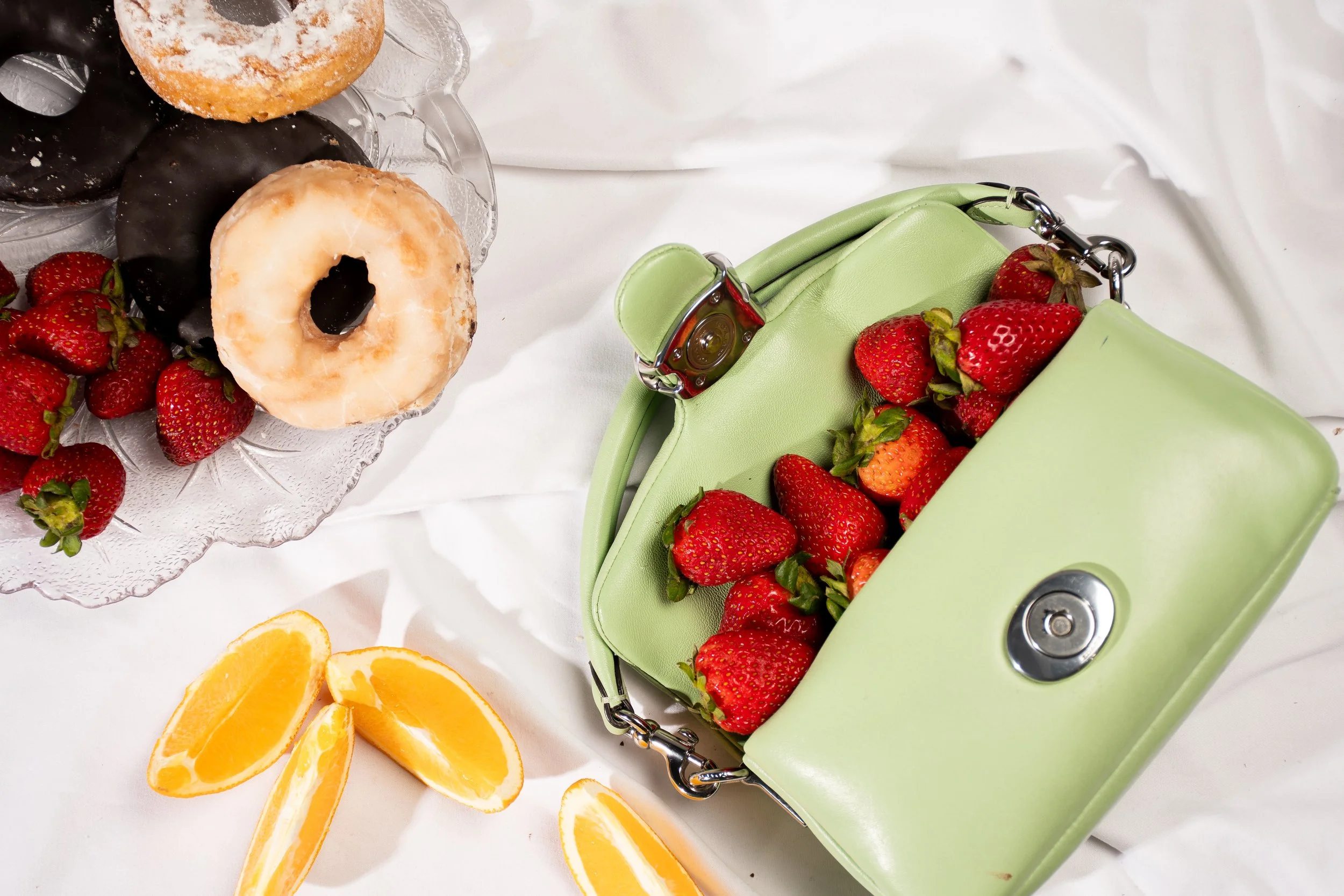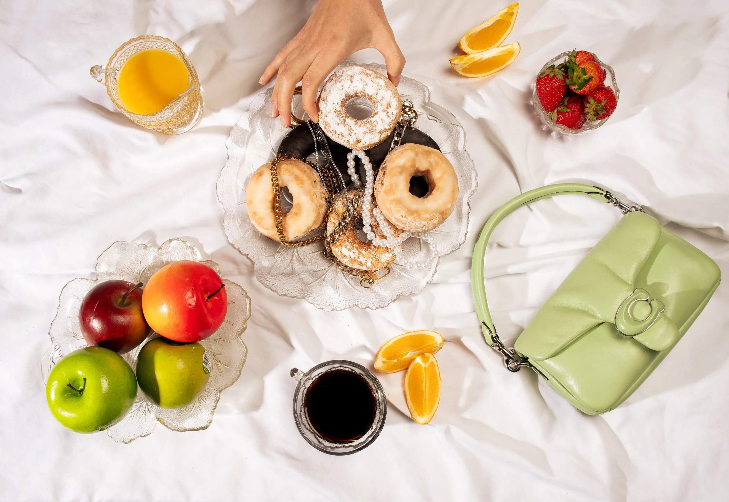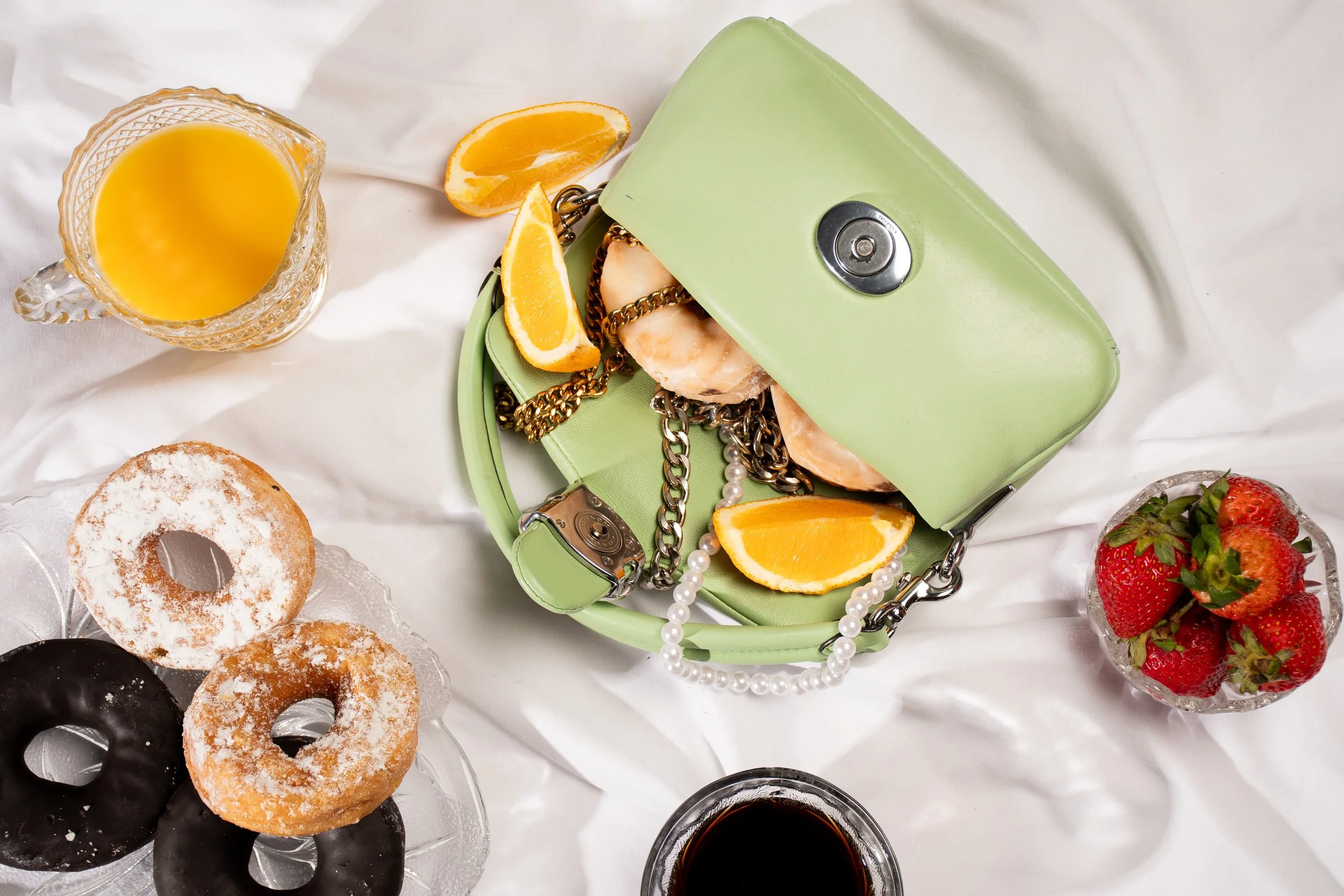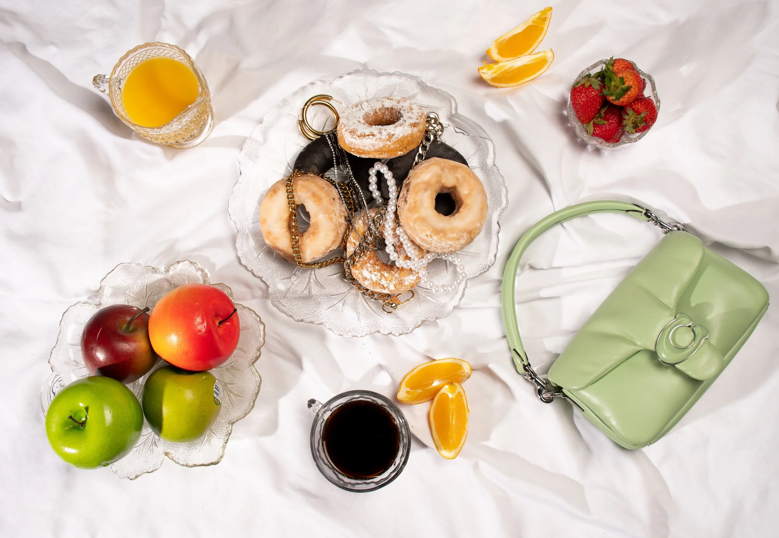 I had the idea to do a “Breakfast in Bed” photoshoot for the Coach Pillow Tabby handbag. It would be a fun idea to play off the name of the bag with the word pillow in it. Before I went into this shoot, I was thinking about what props I wanted, color scheme, and lighting. I knew I wanted the photos to be very bright and complex contrast.