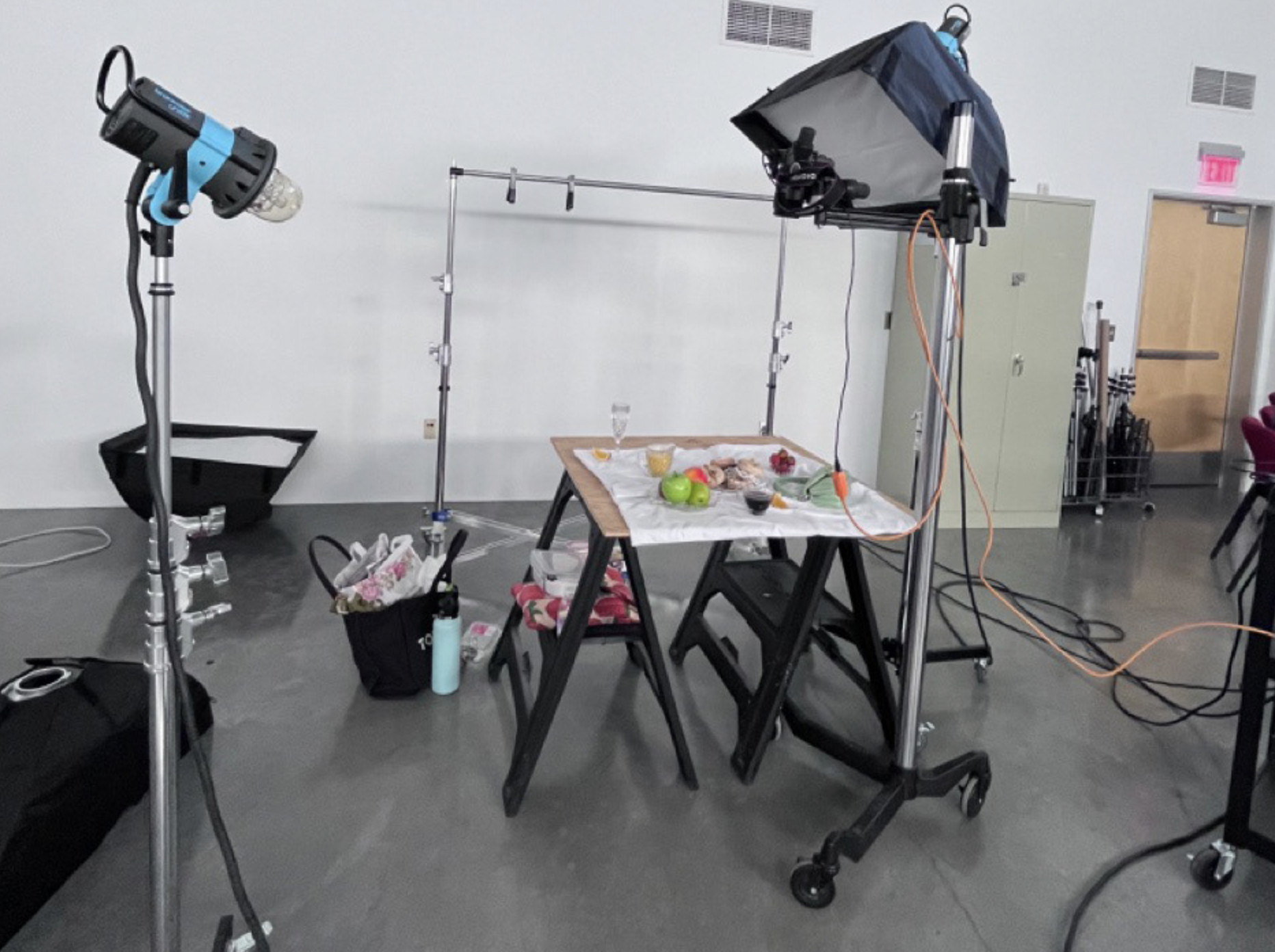 I used an overhead softbox to provide an even amount of light over the setup. This looked nice, but I added a bare bulb light to the side to add exciting lighting and more complex shadows. I experimented with how much light intensity and distance I needed to create the shadows I wanted.